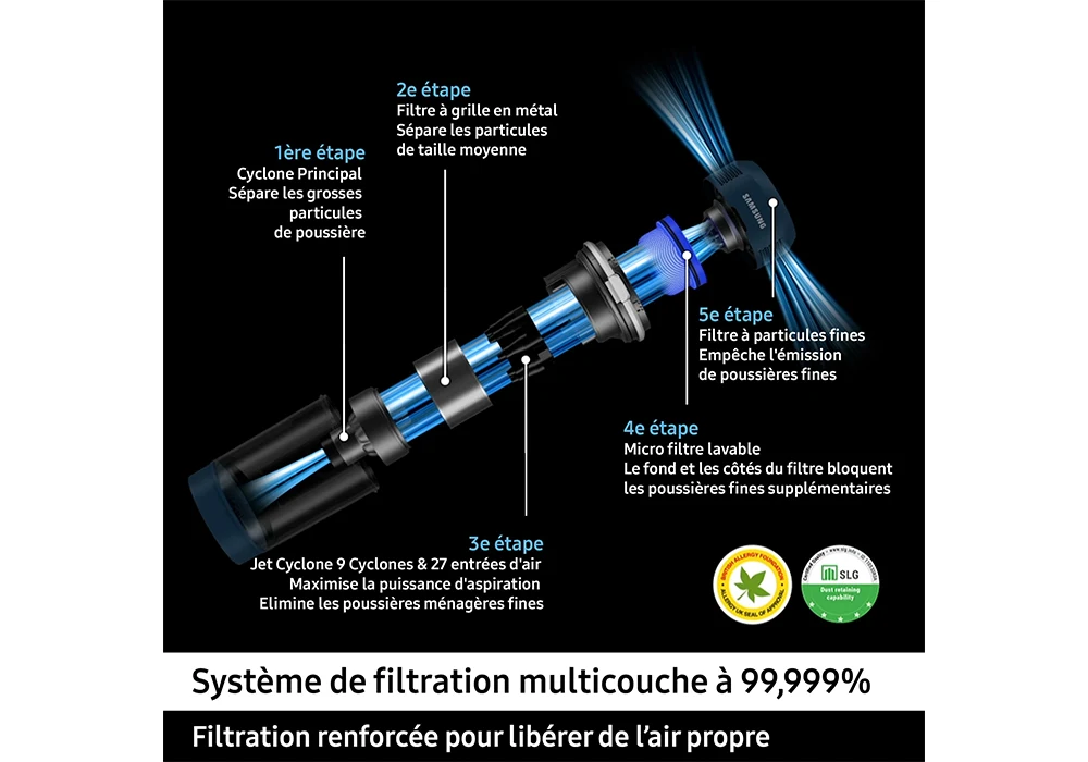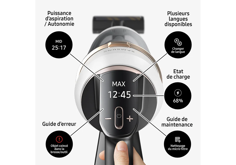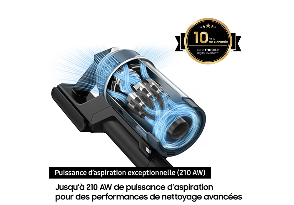 Doté d’un moteur digital inverter ultra performant de 580 Watts, cet aspirateur offre une puissance d’aspiration impressionnante pouvant atteindre 210 air Watts. Il propose 4 niveaux de puissance, dont le mode Jet, idéal pour les surfaces très poussiéreuses.