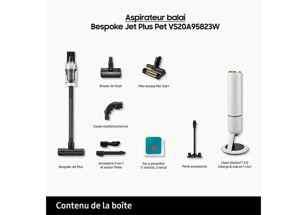 Inclus : 1 x brosse jet dual LED +, 1 x brosse Slim Action LED +, 1 x mini brosse Pet Tool +, 1x porte accessoires, 1x accessoire 2-en-1, 1x suceur fente, 1x coude multidirectionnel et 1x Clean Station 2.0