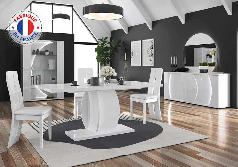 Séjour moderne en panneau de particules épais recouvert de papier blanc brillant. Les portes sont équipées de charnières métalliques à frein. Coulisses métalliques invisibles à frein. Les bandeaux haut et bas sont arrondis revêtus PVC blanc brillant.
