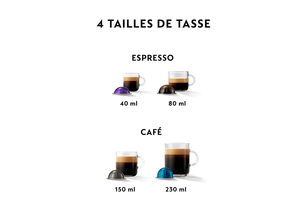 • Cafés Vertuo : Compatible uniquement avec les capsules Vertuo (31 cafés en 5 tailles de tasses).