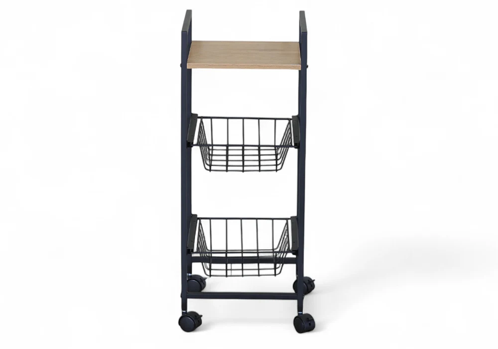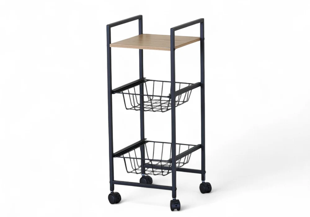 Sa structure en métal coloris noir, fine et robuste, dessine une silhouette contemporaine, tandis que ses étagères en MDF finition chêne OAK apportent une note boisée et chaleureuse à l’ensemble. Montée sur roulettes discrètes et maniables, elle se déplace facilement d’une pièce à l’autre, offrant une flexibilité optimale au quotidien.
