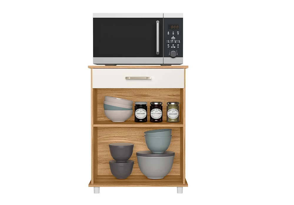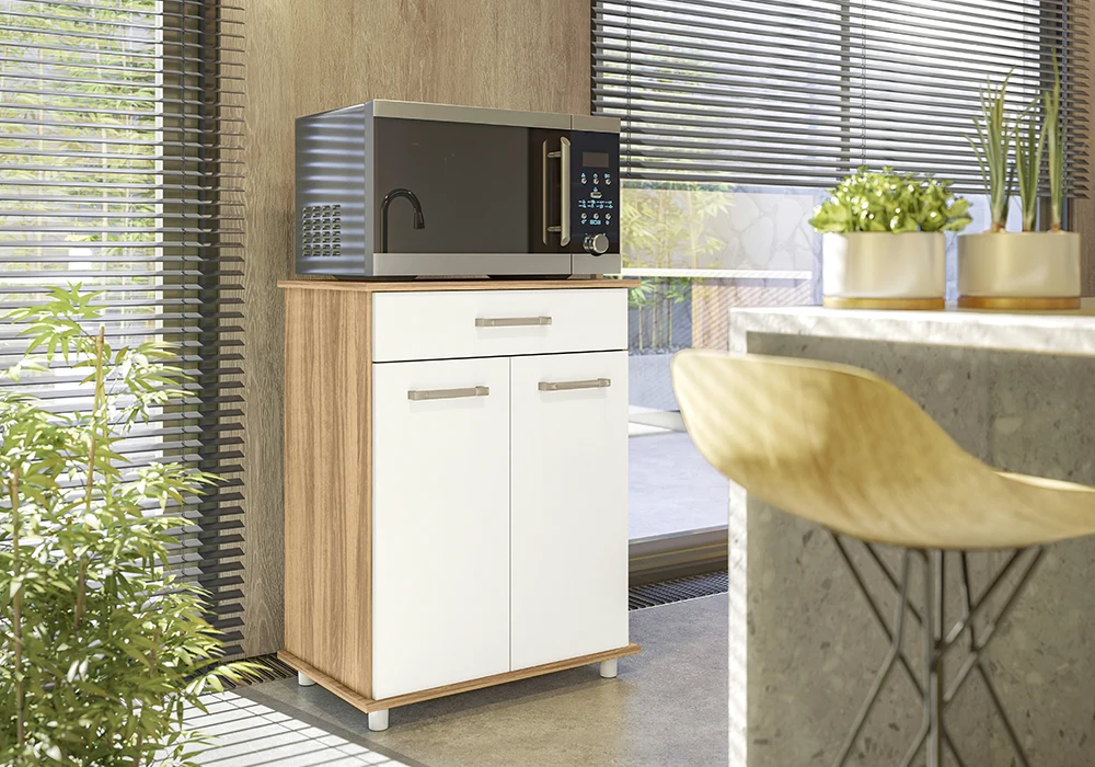Avec ses dimensions compactes, le meuble micro-ondes Isis est parfait pour les cuisines de toutes tailles, offrant une solution de rangement sans encombrement.