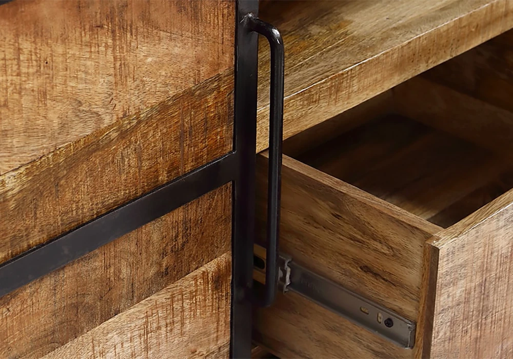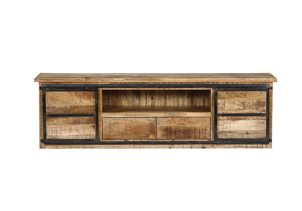 Ce meuble TV, avec ses deux portes et deux tiroirs, offre un espace de rangement généreux tout en ajoutant une touche d’élégance brute à votre intérieur. Les portes sont ornés de poignées en métal, soulignant l’alliance parfaite entre le bois et le métal.