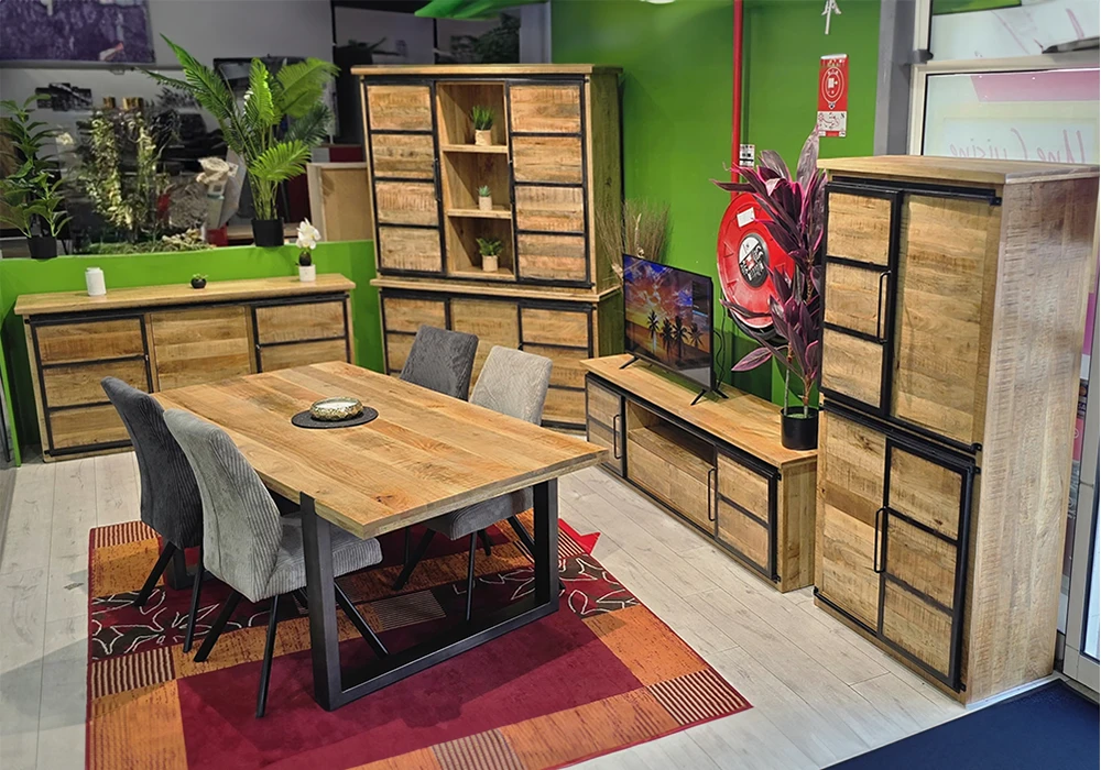 La Collection Wolissan incarne l’essence du style industriel en sublimant le côté rustique grâce à l’utilisation du bois de manguier naturel. Chaque pièce est soigneusement conçue pour rappeler les codes du style industriel : des dimensions imposantes et des détails en métal robustes.