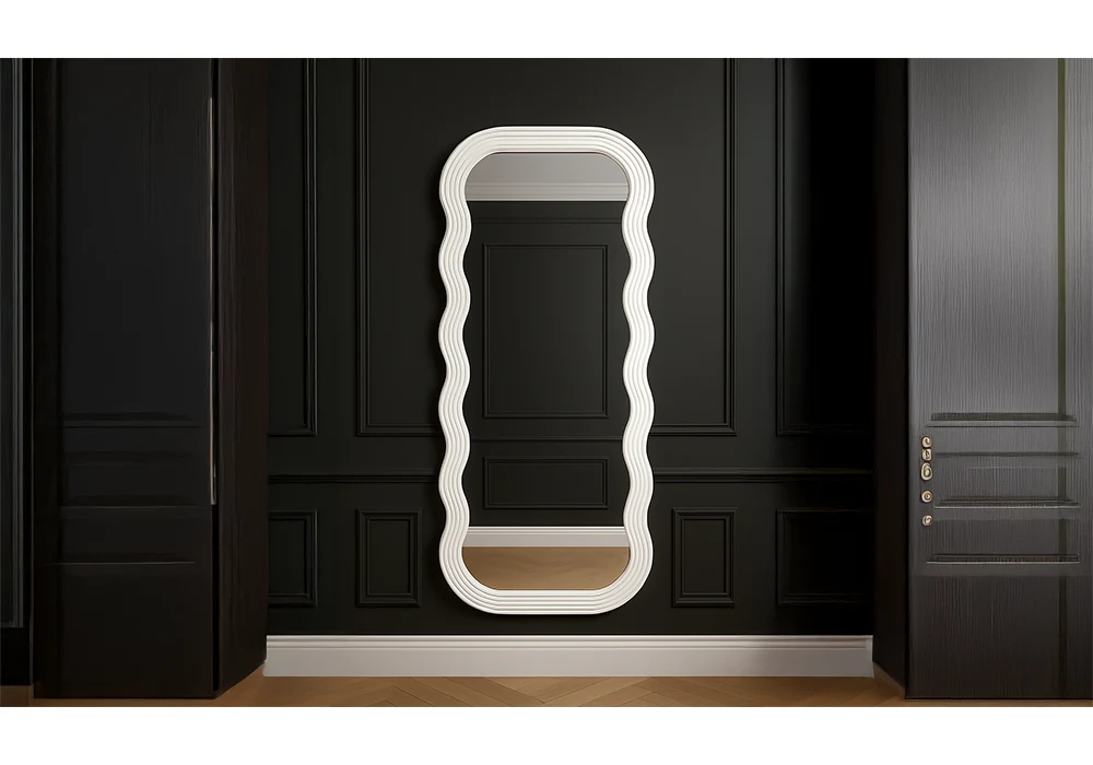 La glace en verre poli sans distorsion garantit un rendu clair et fidèle, encadrée par des bords délicatement ondulés qui insufflent du rythme et de la fluidité à l’ensemble.