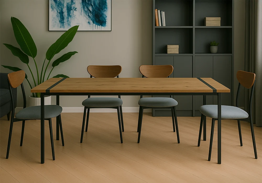 Pensée pour les intérieurs à forte personnalité, cette table rectangulaire impose sa présence avec sobriété. Elle s’intègre naturellement dans un loft urbain, une salle à manger moderne ou un espace de coworking au style brut.