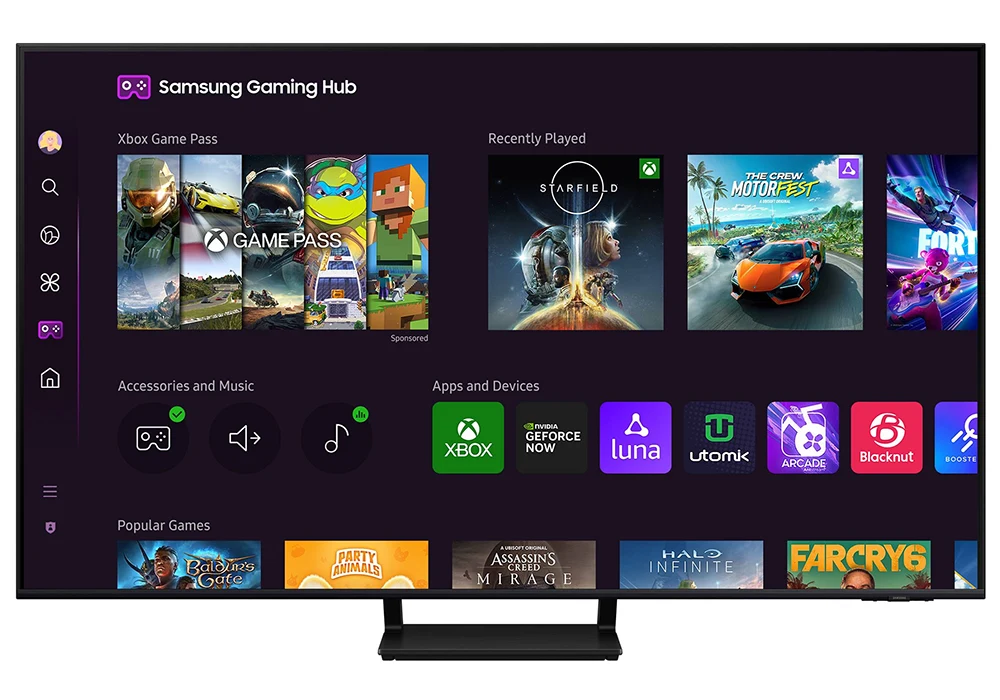 Smart TV : Tizen, avec assistants vocaux intégrés (Bixby), contrôle vocal et applications principales (